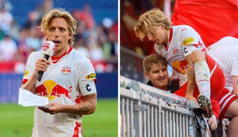 Kurz nach Schlusspfiff versammelten sich die Kicker des FC Red Bull Salzburg vorm harten Fan-Kern, der noch nicht den Heimweg angetreten hatte. Besonders in Szene setzte sich dabei Kapitän Mads Bidstrup, der zum Mikrofon griff. Dabei blieb es aber nicht.